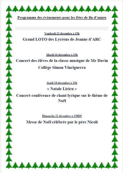 Ensuite, le mardi 16 décembre à 15h, nous aurons le plaisir d'accueillir la classe-musique de 6ème de Monsieur Davin, professeur de musique au collège Simon Vinciguerra. Cette classe nous avait déjà gratifié d'un magnifique concert le printemps dernier, nous aurons donc le plaisir de les recevoir à nouveau en cette période de fête pour qu'il nous présente un nouveau répertoire. Nous accueillerons également un groupe de résidents de l’Ehpad Notre-Dame de Bastia pour partager ce moment en notre compagnie.